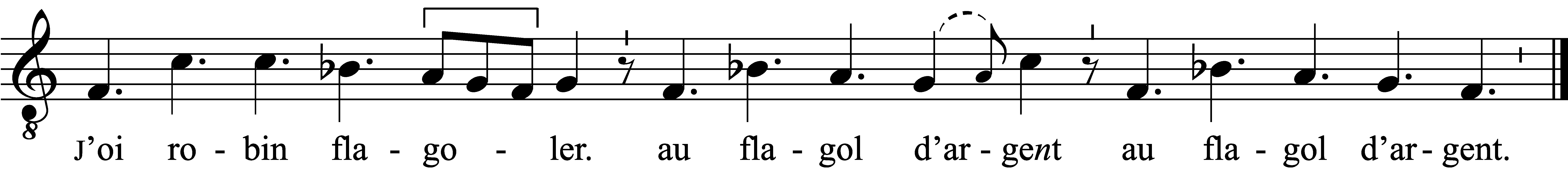 - J’oi robin flagoler. au flagol d’arge{n}t au flagol d’argent.