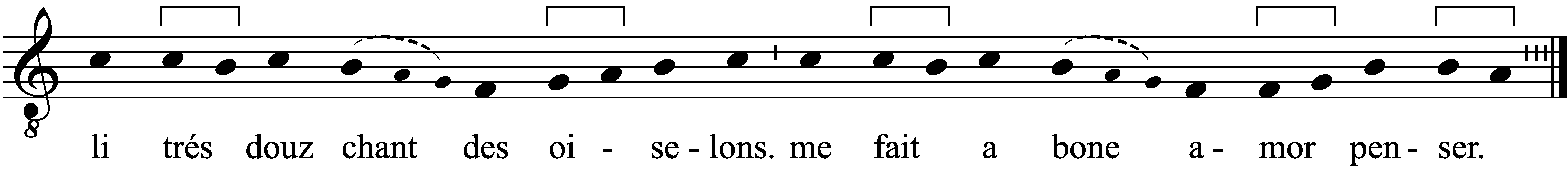 - li trés douz chant des oiselons. me fait a bone amor penser. (st. I, final refrain)