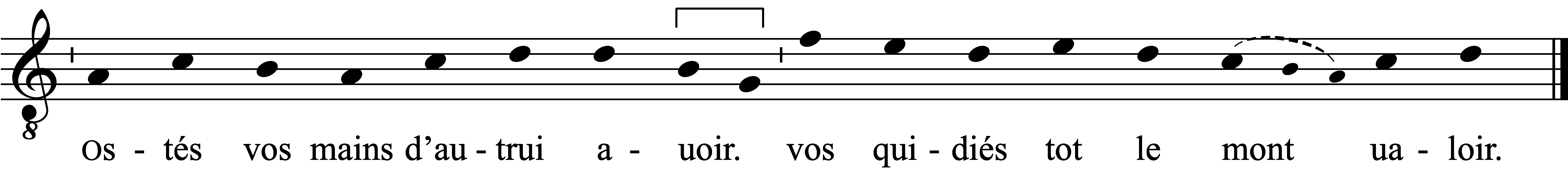 - Ostés vos mains d’autrui auoir. vos quidiés tot le mont ualoir. (st. V, final refrain)