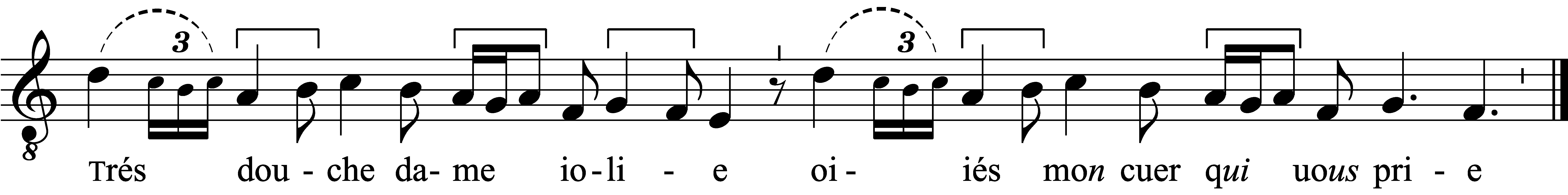 vdB 1797: Trés douche dame jolie, oiiés mon cuer qui vous prie. (Refrain)