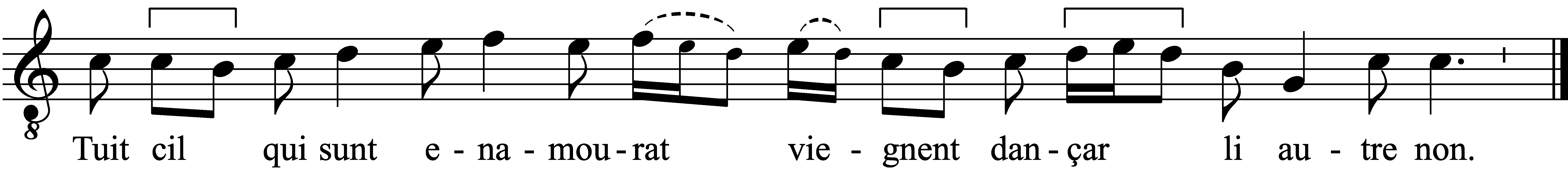 - <T>uit cil qui sunt enamourat viegnent dançar li autre non. (refrain 1)