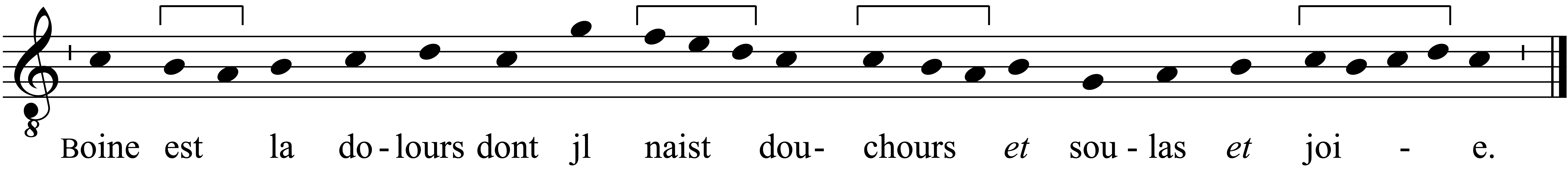 - Boine est la dolours dont jl naist douchours {et} soulas {et} joie. (st. I, final refrain)