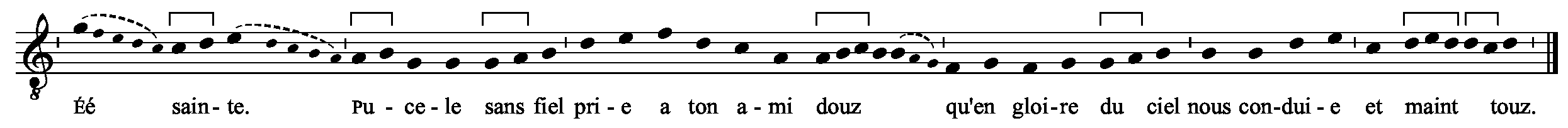 - Éé sainte. Pucele sans fiel prie a ton ami douz qu’en gloire du ciel nous conduie et maint touz. (st. I, final refrain)